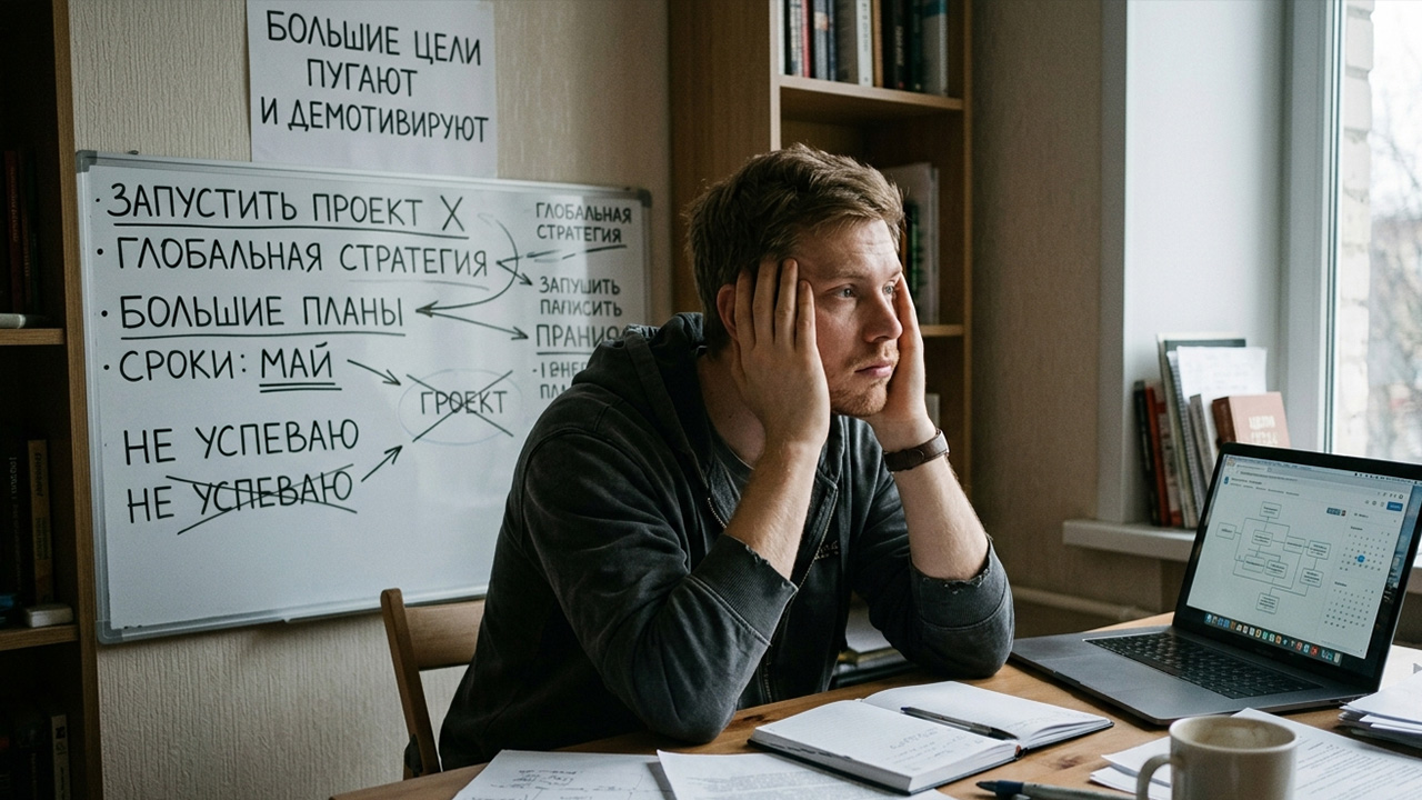 Анна работает над отчетом, который нужно сдать через месяц. Проект огромный. Каждый раз, садясь за него, она чувствует тяжесть. Мозг предлагает: «Давай лучше проверим почту, там точно есть что-то важное». Анна отвлекается. Дни идут, отчет не двигается.